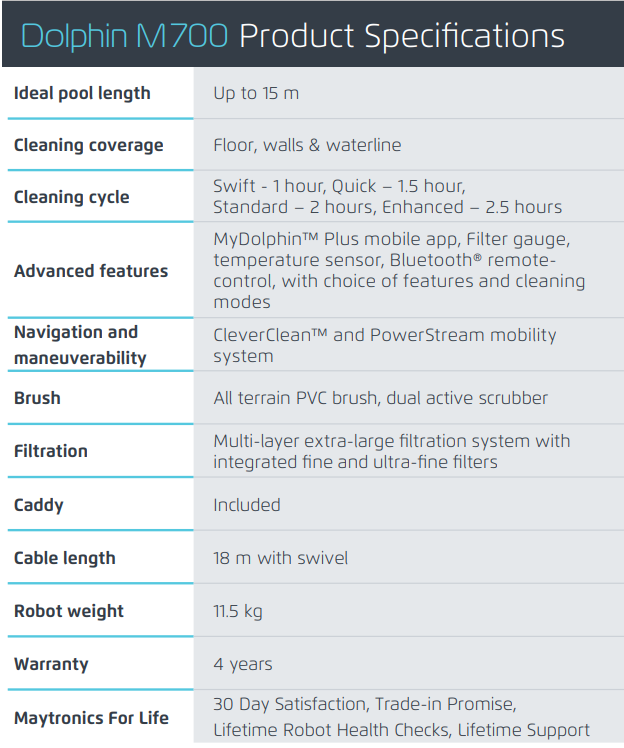 The Maytronics Dolphin M700 was masterfully designed to deliver incomparable scrubbing of the floor, walls, and waterline. New features include a unique sensor to measures water temperature and a filter gauge that accurately measure how full the internal filters are.