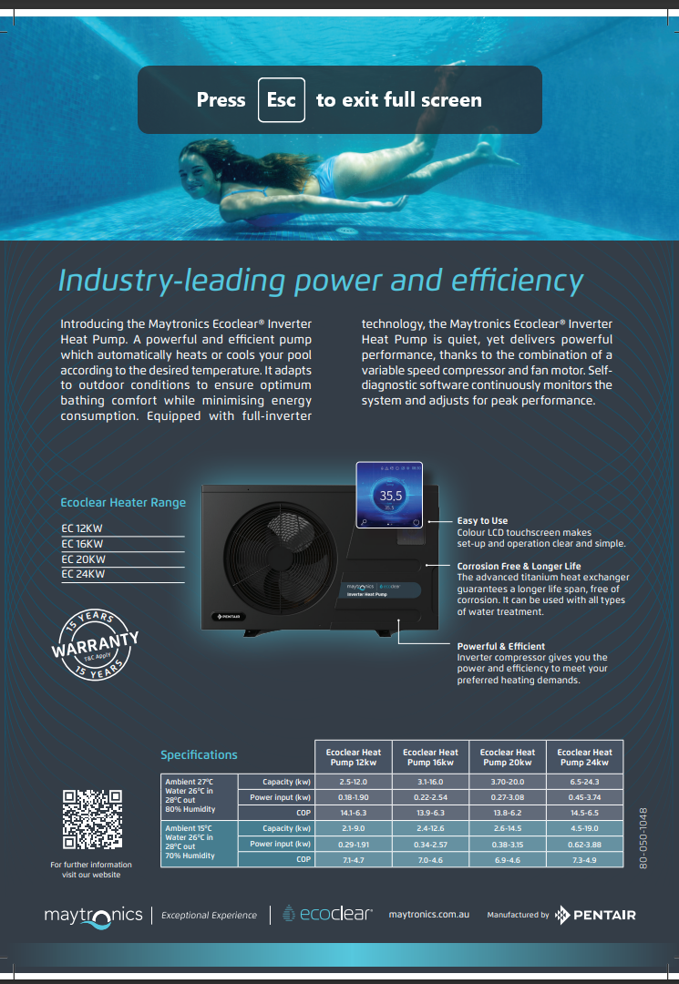 The Maytronics Ecoclear® Inverter Heat Pump. A powerful and efficient pump which automatically heats or cools your pool according to the desired temperature. It adapts to outdoor conditions to ensure optimum bathing comfort while minimising energy consumption. Equipped with full-inverter technology, the Maytronics Ecoclear Inverter Heat Pump is quiet, yet delivers powerful performance, thanks to the combination of a variable speed compressor and fan motor. Self-diagnostic software continuously monitors the system and adjusts for peak performance.